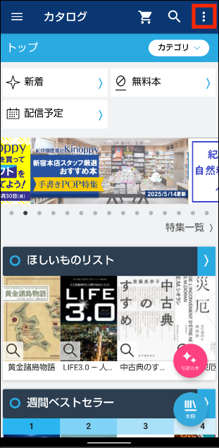 1. カタログ画面を表示して画面右上にあるメニューボタンをタップします。