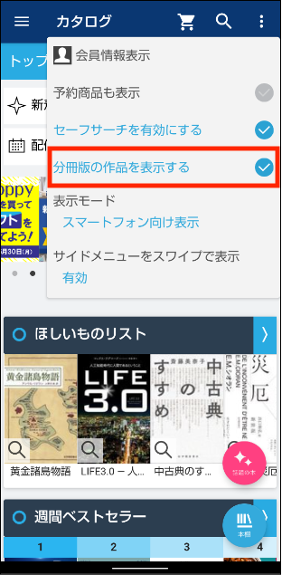 2. メニューから「分冊版の作品を表示する」のチェックをオンにします。