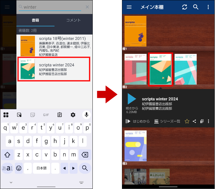 3. 検索結果に表示されたリストをタップすると、タップした本がある場所へ画面が移動し、本のメニューを表示した状態になります。