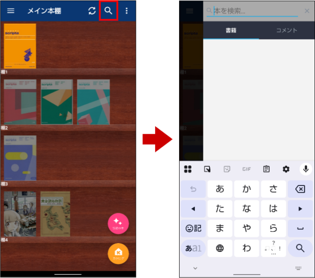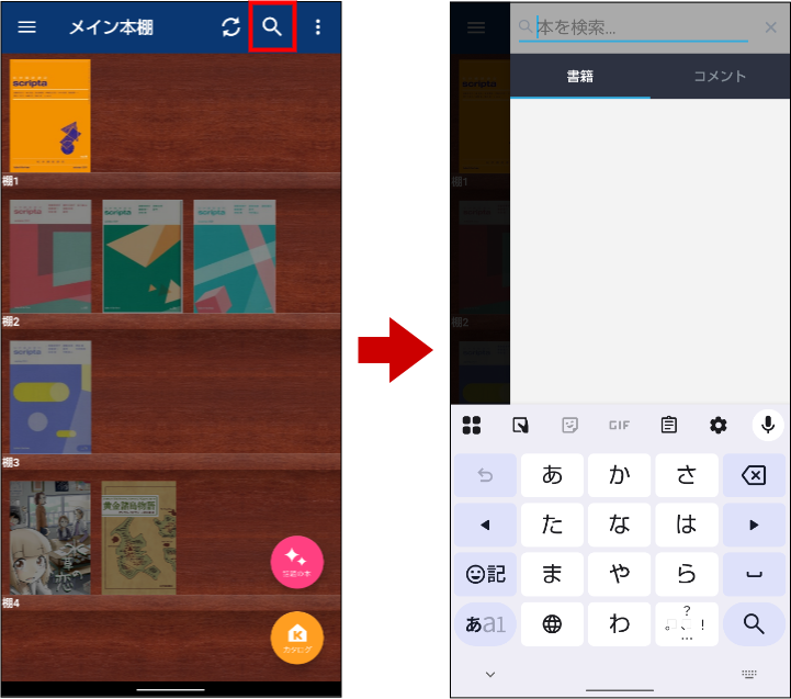 1. 本棚の右上にある検索ボタンをタップして右メニューを表示します。