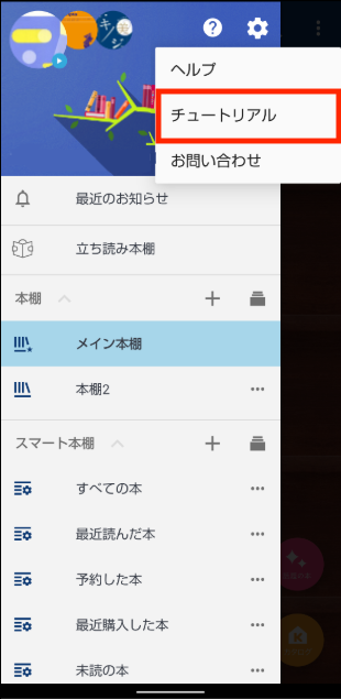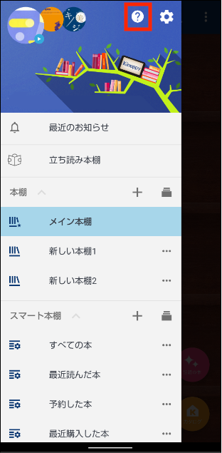 1. 本棚左メニューを開き「?」ボタンをタップします。