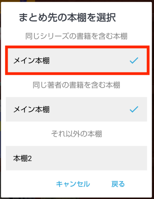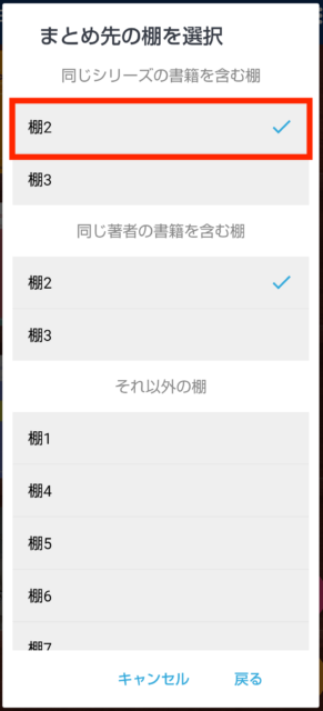 5. 本棚選択画面にて、まとめたい既存の棚がある本棚を選択します。