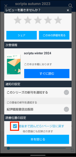 2. 「最後まで読んだら1ページ目に戻す」のチェックをオンにしてビューアを閉じます。
